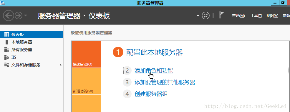 1.進入操作系統,直接從啟動欄打開服務器管理器,選擇添加功能和角色