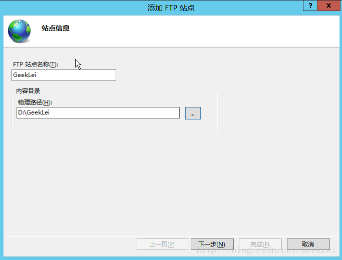 3.填寫站點名稱和物理路徑,物理路徑即FTP上傳下載文件的保存目錄