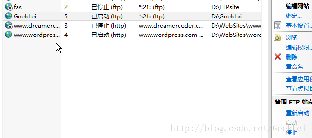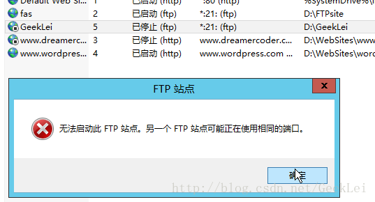 6.因為我已經創建過FTP站點了,默認都是21端口,所以無法啟動這個站點。當有多個FTP站點使用同一端口時不能同時開啟。