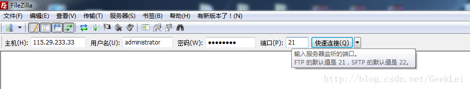 1.從自己PC上打開工具,我用的是FileZillaClient,輸入主機ip,用戶名和密碼(云主機服務商提供的,服務器開機密碼),端口號21,點擊快速連接