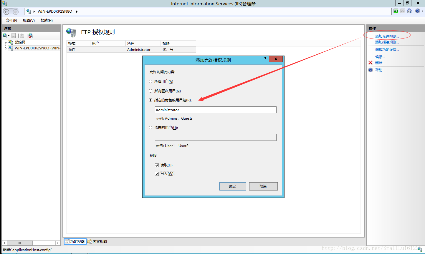 7.FTP界面選擇 “FTP授權規則“—>右側“添加允許規則”–>選擇“指定的角色或用戶組”,以及權限選擇,“讀取 寫入”