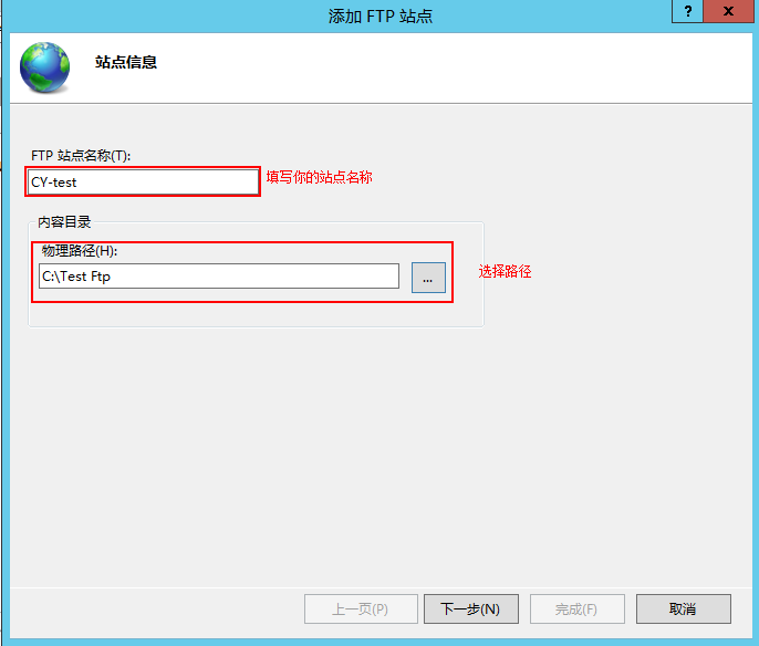3、填寫站點名稱和選擇物理路徑,物理路徑即FTP上傳下載文件的保存目錄