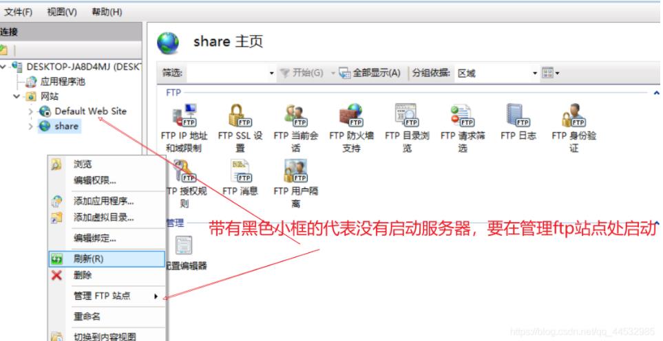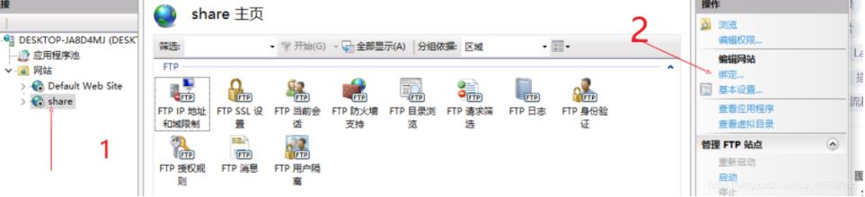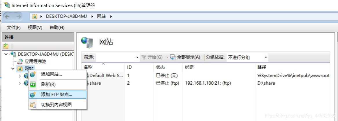 5 點擊網站,選擇添加FTP站點,然后輸入ftp站點的名稱,并選擇共享的文件路徑,可以是某個文件夾,也可以是整個磁盤