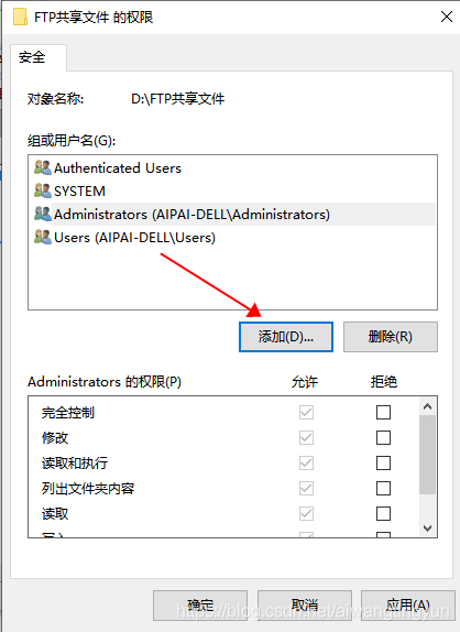 然后在 FTP 共享文件的權限彈窗中點擊"添加"