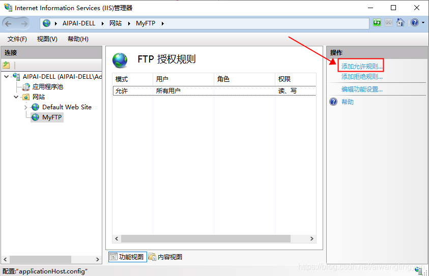 回到 Internet Information Services (IIS) 管理器,雙擊剛才選中的 “FTP授權規則”,點擊右側的"添加允許規則"