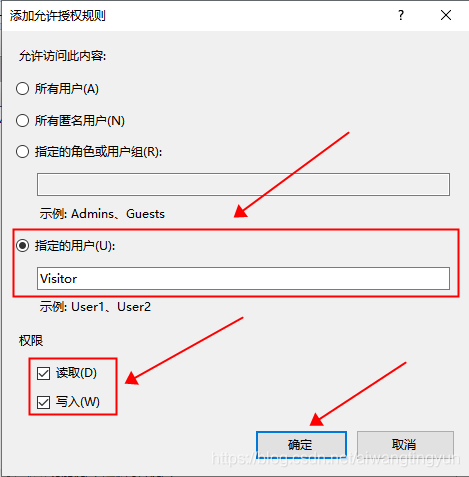 在"添加允許授權規則"窗口中選擇指定用戶,并輸入我們新建的用戶名,權限可以選擇讀取或者寫入,一般我們可以創建兩個賬號,一個用戶只允許訪問(讀取),一個用來讀寫操作(讀取和寫入)