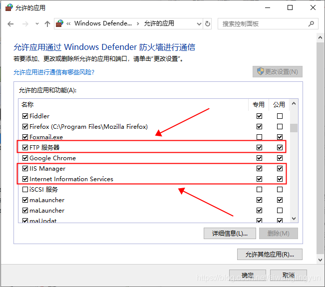 選擇:控制面板 >> 系統和安全 >> Windows Defender 防火墻 >> 允許的應用,找到 FTP 服務器,把后面兩個框都勾選掉: