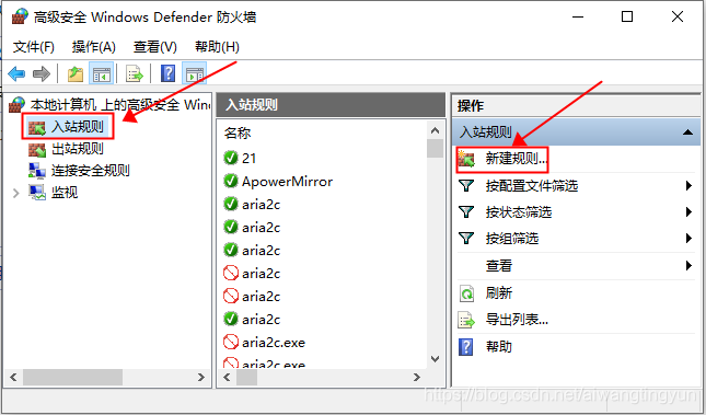 配置好防火墻允許應用程序之后,由于 FTP 使用的是 21 端口,所以還得在防火墻中添加入站和出站規則,在 windows防火墻窗口中點擊左側的"高級設置",在彈出的"高級安全 Windows Defender 防火墻"窗口中點擊左側的"入站規則",然后點擊右側的"新建規則":