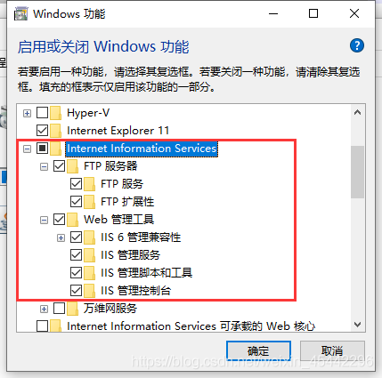 3、找到“Internet Information Service ( Internet信息服務(wù) )”,選中“FTP服務(wù)” 和 “Web管理工具”點擊確定