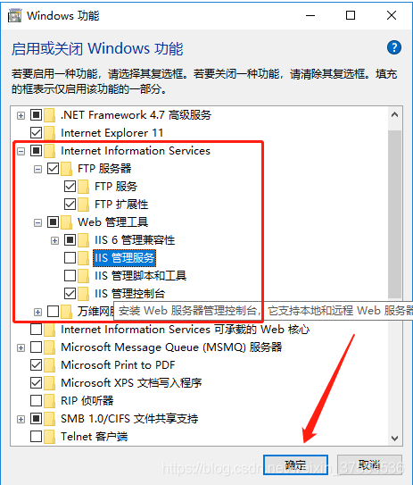 四:在“windows功能”中找到“Internet Information Service ( Internet信息服務(wù) )”,并選中“FTP服務(wù)”、“FTP擴(kuò)展性”和“IIS管理控制臺(tái)”前的復(fù)選框,點(diǎn)擊“確定”;