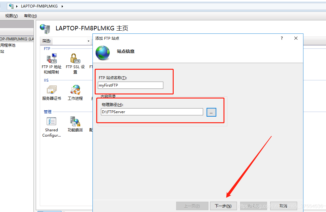 七:填寫(xiě)“FTP站點(diǎn)名稱(chēng)”和“物理路徑”,點(diǎn)擊下一步;