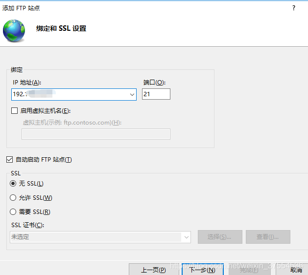 八:設(shè)置“綁定和SSL設(shè)置”,在“IP地址”處,可以用內(nèi)網(wǎng)IP也可以用外網(wǎng)IP,訪客自然也就根據(jù)你的IP設(shè)定來(lái)決定,點(diǎn)擊下一步;