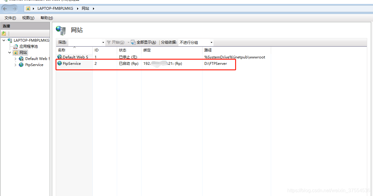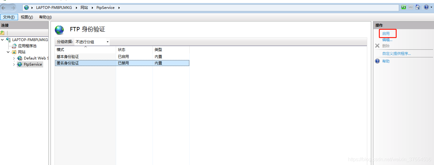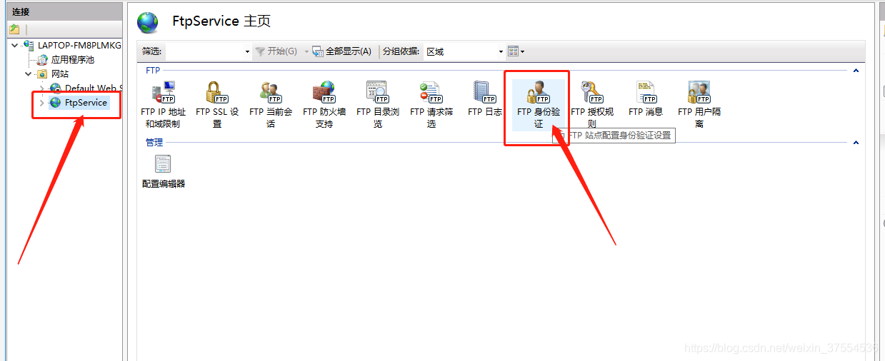 十一:打開(kāi)Internet Information Service(IIS)管理器窗口,點(diǎn)擊自己之前創(chuàng)建的FTP站點(diǎn),點(diǎn)擊,在左側(cè)窗口內(nèi)找到“FTP身份驗(yàn)證”,雙擊進(jìn)入;