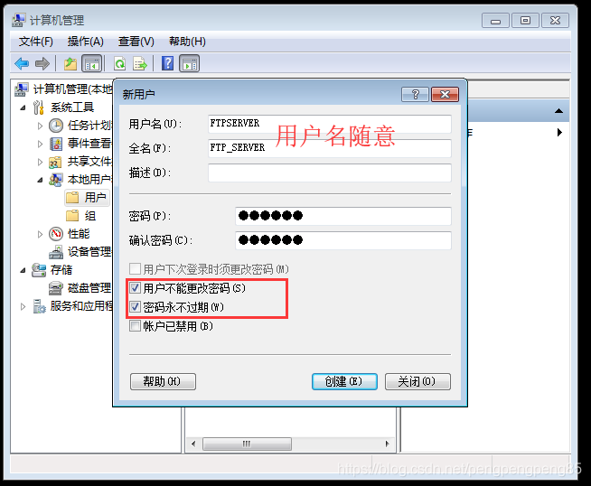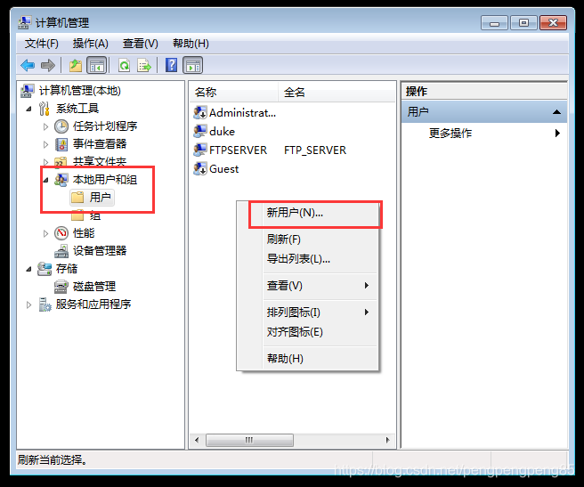 1.創建用于登陸ftp的用戶:打開計算機管理程序,依次點擊左側本地用戶組–>用戶,右側空白處右擊點擊“新用戶”。