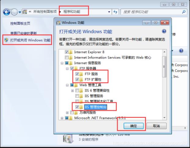 3.控制面板中找到程序和功能,在左側的菜單點擊“打開或關閉Windows功能”,在彈窗的窗口中勾選FTP服務、FTP擴展性、IIS管理控制臺,只需要勾選途中框起來的3個即可,確定后等待幾分鐘即可完成,部分設備可能需要重新啟動計算機。