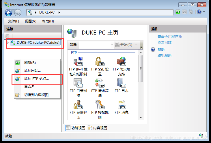 6.win + R 運行 InetMgr 打開 Internet 信息服務(IIS)管理器,在左側的 空白區域右擊選擇“添加FTP站點…”。