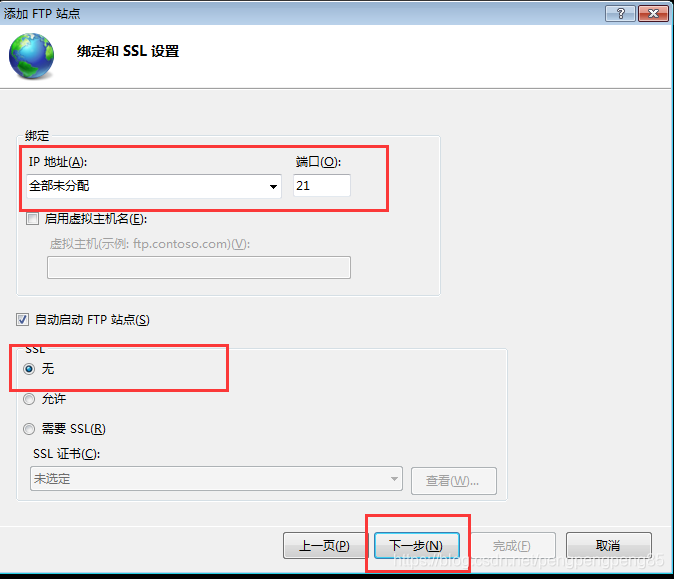 8.IP地址默認全部未分配即可,端口號默認21,SSL這里選無。