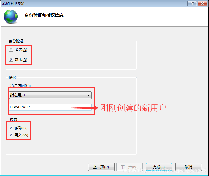 9.因為我要求FTP服務只能通過新建的用戶登入,所以身份驗證選基本,授權這里指定剛剛創建的用戶。