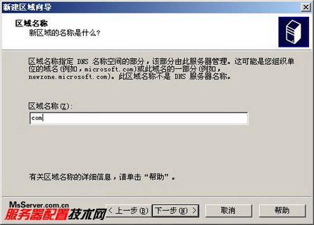 第2步,在“區域類型”選項卡中保持默認選項“主要區域”的選中狀態,單擊“下一步”按鈕。接著在“區域名稱”選項卡中輸入合適的區域名稱,如COM。依次單擊“下一步”→“完成”按鈕完成設置,如圖2008121201所示。