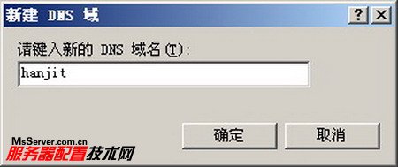 第3步,展開并選中剛才新建的COM區域,在打開的快捷菜單中執行“新建域”命令,打開“新建DNS域”對話框。在該對話框中輸入一個合適的域名,如hanjit,并單擊“確定”按鈕,如圖2008121202所示。
