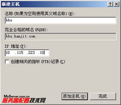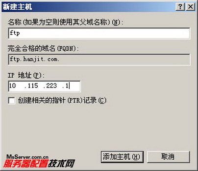 第4步,依次展開com區域→hanjit域,右鍵單擊hanjit域,在打開的快捷菜單中執行“新建主機”命令,打開“新建主機”對話框。在“名稱”編輯框中輸入一個能反映該域名主要用途的主機名稱,如FTP。在“IP地址”編輯框輸入FTP服務器綁定的IP地址,如10.115.223.1,并依次單擊“添加主機/確定”按鈕,如圖2008121203所示。