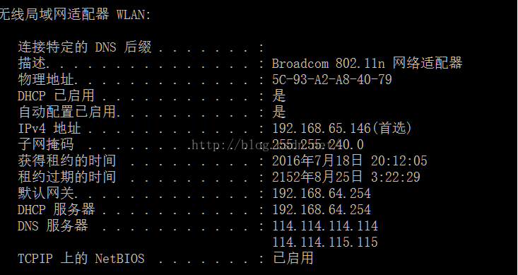 然后是在運行cmd中輸入ipconfig/all 查看網關和DNS服務器的地址
