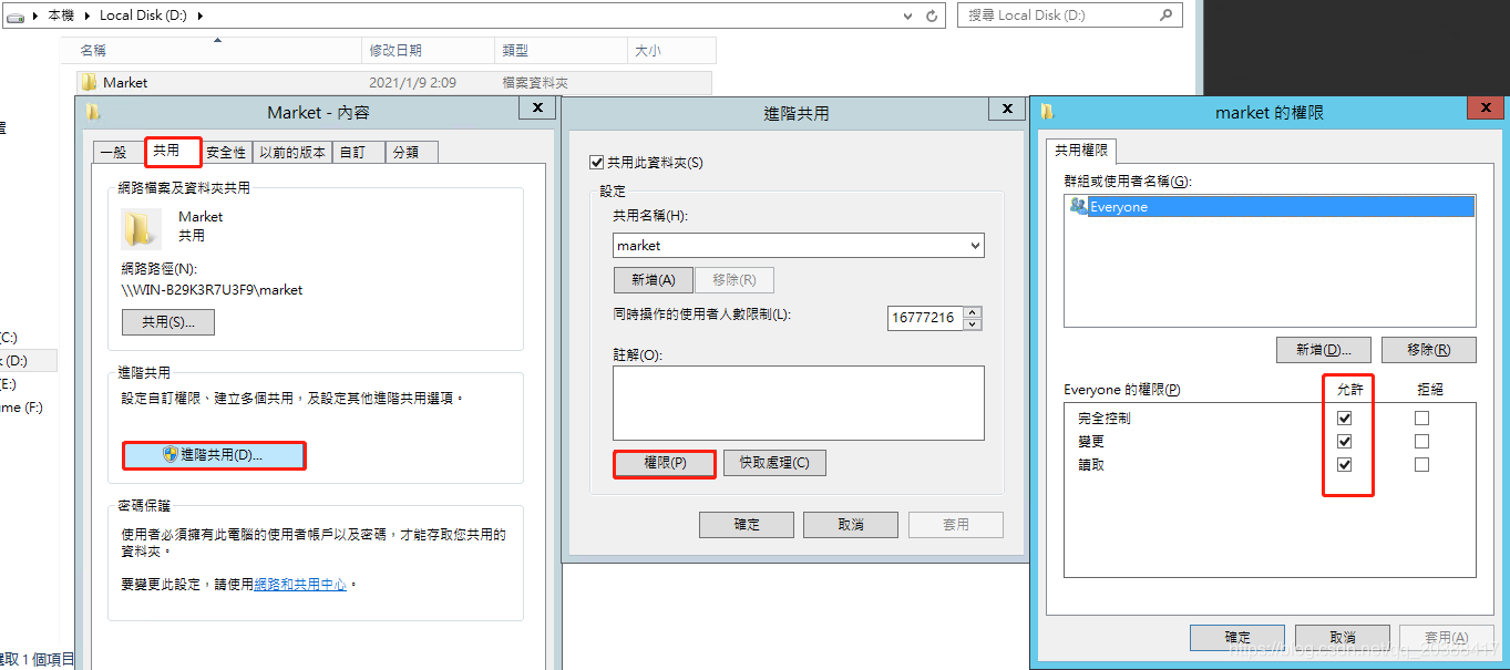 這里有一點要注意:在配置權限的時候,你必需要配置一個具有完全控制權限的用戶/組。否則,后面創建SMB的時候會失敗。