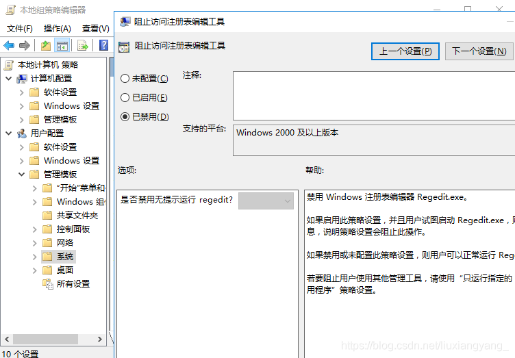 運(yùn)行 gpedit.msc,在用戶配置 - 管理模板 - 系統(tǒng)中修改組織訪問注冊表編輯工具為已禁用