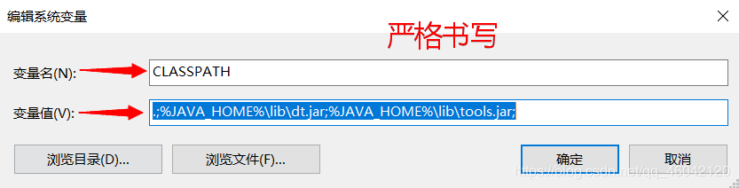 - 語句錯誤:CLASSPATH的變量值錯誤,開頭一定有點“.”!!!(直接復(fù)制粘貼,見下文。)