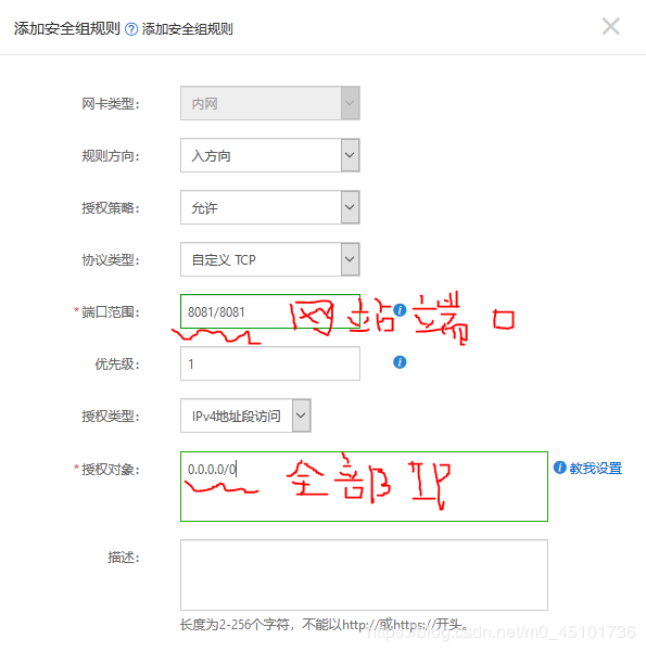 24.規則方向選擇入方向,端口范圍填寫發布網站的端口號,授權對象填寫0.0.0.0/0表示全部ip