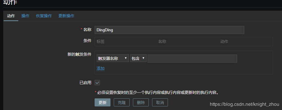 配置--->動作--->創建動作,把微信告警或者郵件告警的“操作”和恢復操作內容拷貝過來即可。