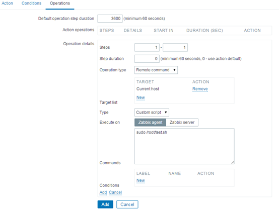 Execute on:選擇"Zabbix agent",命令為" sudo /root/test.sh"