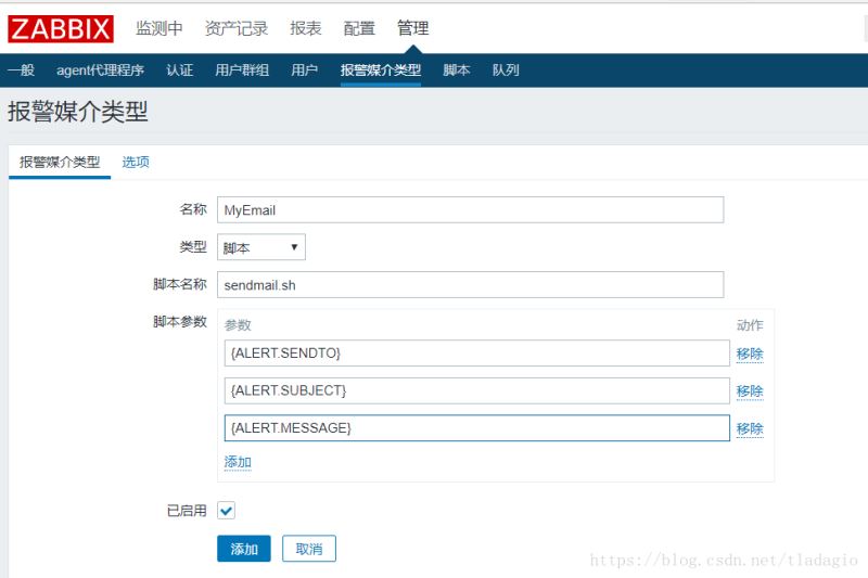 {ALERT.SENDTO} {ALERT.SUBJECT} {ALERT.MESSAGE}如果在3.0中不添加這三個參數會報錯,因為在3.0以后zabbix允許自定義參數了,所以不會默認傳遞參數,在2.0的時候會默認傳遞三個參數,所以在3.0如果不寫這三個參數會報錯。