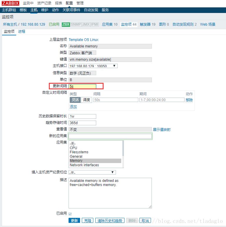 2)可以將zabbix自帶的模板中的對可用內存的監控中的觸發器的臨界值改為大于20,進入模板列表