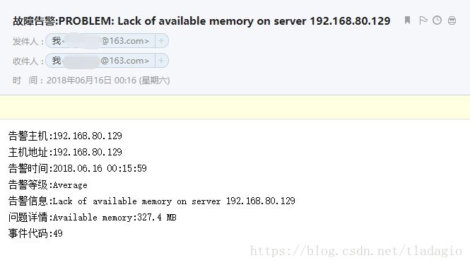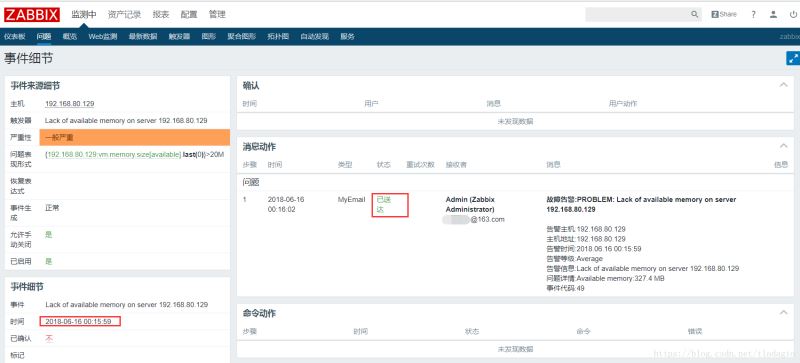 到這我們的郵件報警配置就完成了,這是只要我們設置的觸發器觸發,就會自動給我發送報警郵件。