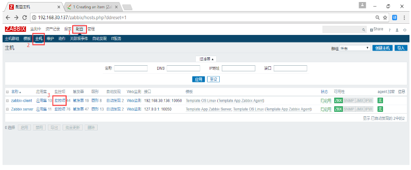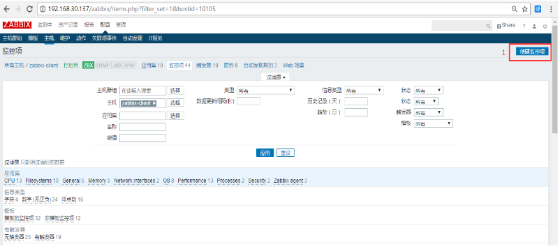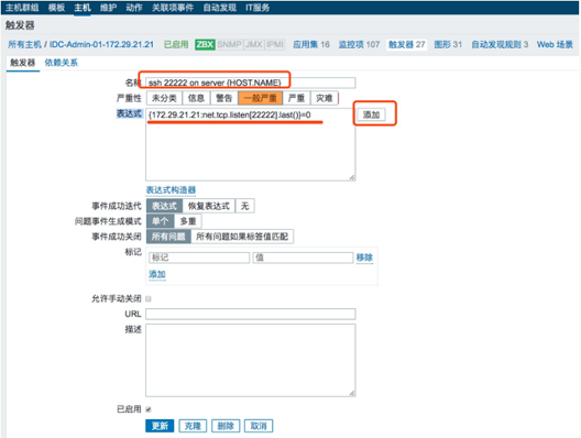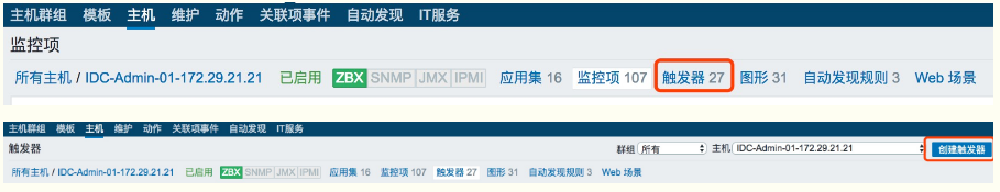 選擇主機,點擊【觸發器】,【創建觸發器】