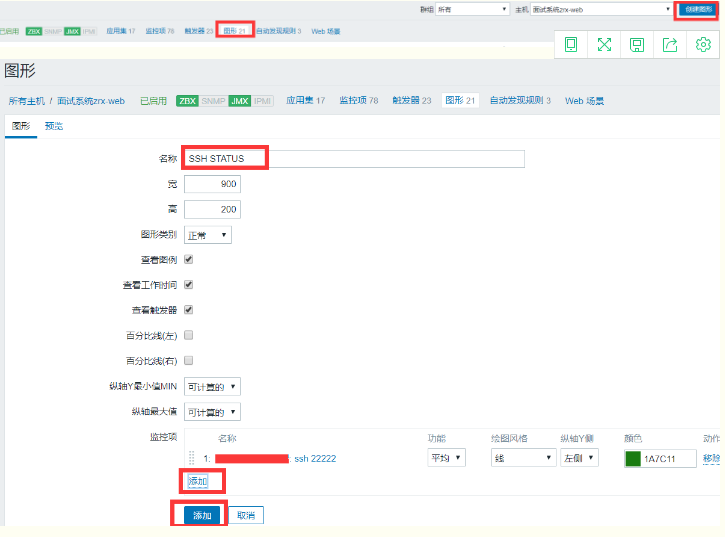 需要先定義這個端口的監控項(items),監控項可以添加在模版中(create items),也可以單獨定義在主機上(下面例子是在主機上定義的監控項)