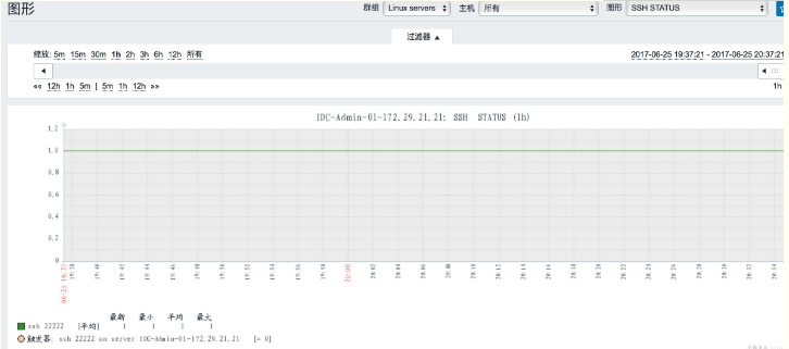最后就可以在該主機的監控圖形中查看到上面添加的ssh端口狀態了:1表示該端口正常運行,0表示該端口關閉。