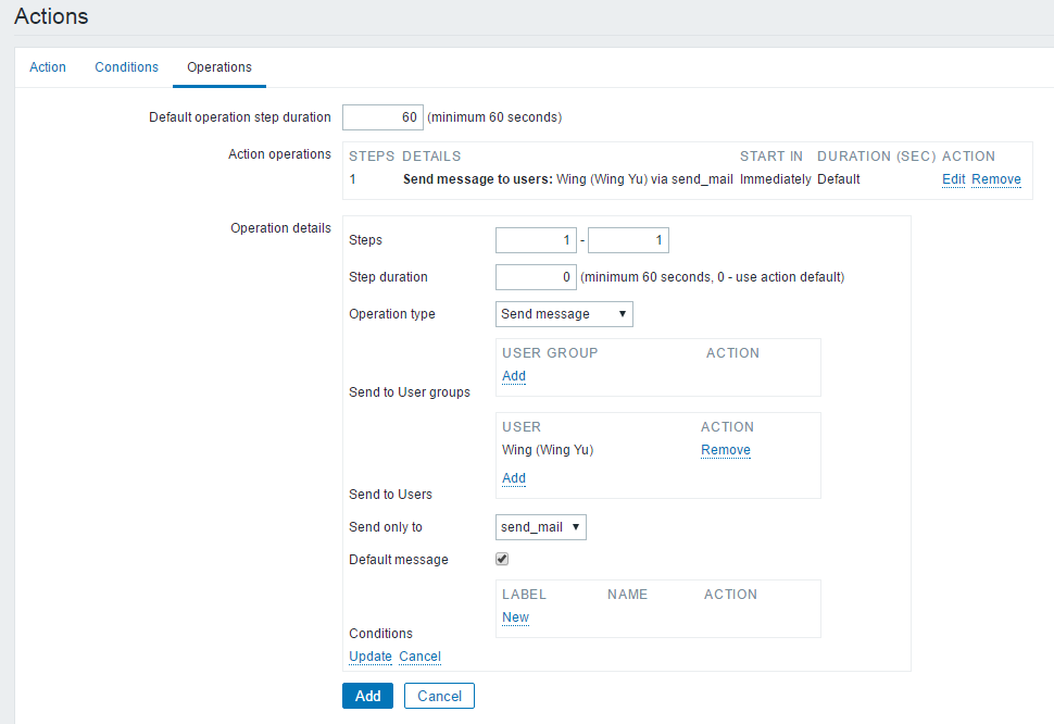 創建action實現郵件報警Configuration –> Actions –> Create action
