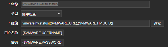 用到的參數(shù)是:{$VMWARE.URL},{$VMWARE.USERNAME},{$VMWARE.PASSWORD},{$VMWARE.HV.UUID}
