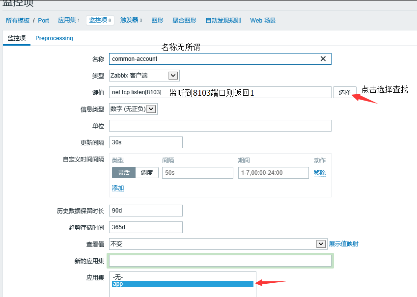 6.Port是模板名,如果這里選擇寫主機名或主機ip,則會變成單個主機的監控項,而不是模板的。