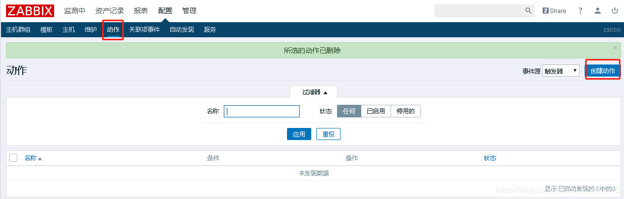 3、還有一個原因,如果你添加的動作是在觸發了報警之后的,那么也不會發郵件,所以在設置動作時所選定的觸發器最好是健康的,如果是為了測試,最好加完動作之后再改觸發器的閾值。