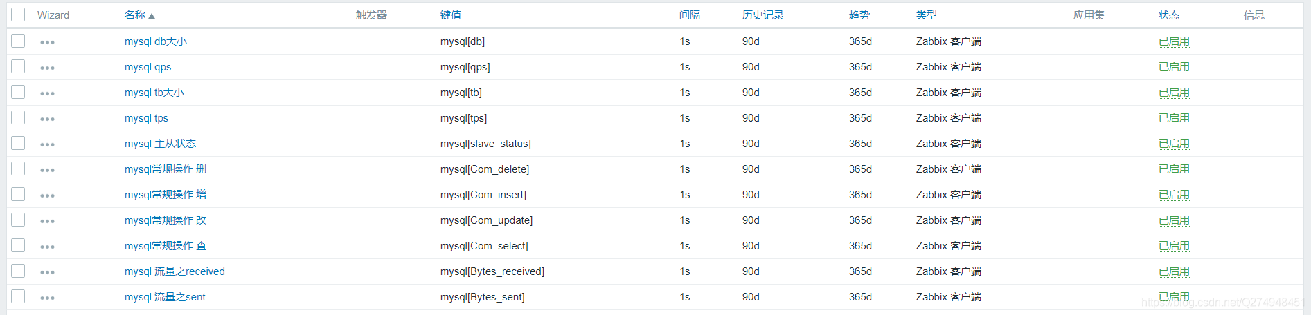 [root@localhost ~]# yum -y install zabbix-get[root@localhost ~]# zabbix_get -s 192.168.27.137 -k mysql[slave_status]2[root@localhost ~]# zabbix_get -s 192.168.27.137 -k mysql[Bytes_received]850970[root@localhost ~]# zabbix_get -s 192.168.27.137 -k mysql[Bytes_sent]224906[root@localhost ~]# zabbix_get -s 192.168.27.137 -k mysql[Com_insert]3001[root@localhost ~]# zabbix_get -s 192.168.27.137 -k mysql[Com_delete]135[root@localhost ~]# zabbix_get -s 192.168.27.137 -k mysql[Com_update]128[root@localhost ~]# zabbix_get -s 192.168.27.137 -k mysql[Com_select]19[root@localhost ~]# zabbix_get -s 192.168.27.137 -k mysql[qps]0.864842[root@localhost ~]# zabbix_get -s 192.168.27.137 -k mysql[tps]1.92936[root@localhost ~]# zabbix_get -s 192.168.27.137 -k mysql[db]555118[root@localhost ~]# zabbix_get -s 192.168.27.137 -k mysql[tb]420