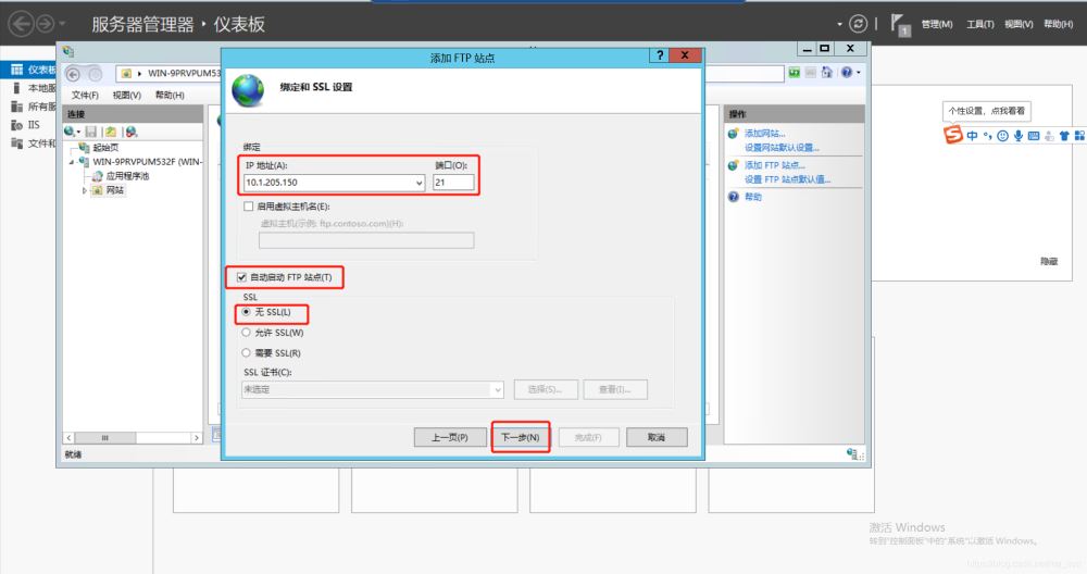 這里需要多說一下:綁定信息的設(shè)置其中包含了,F(xiàn)TP服務(wù)器訪問的地址,F(xiàn)TP服務(wù)器端口號及開機(jī)自啟動和FTP證書配置