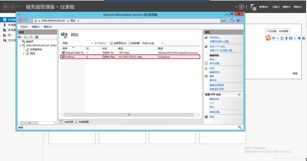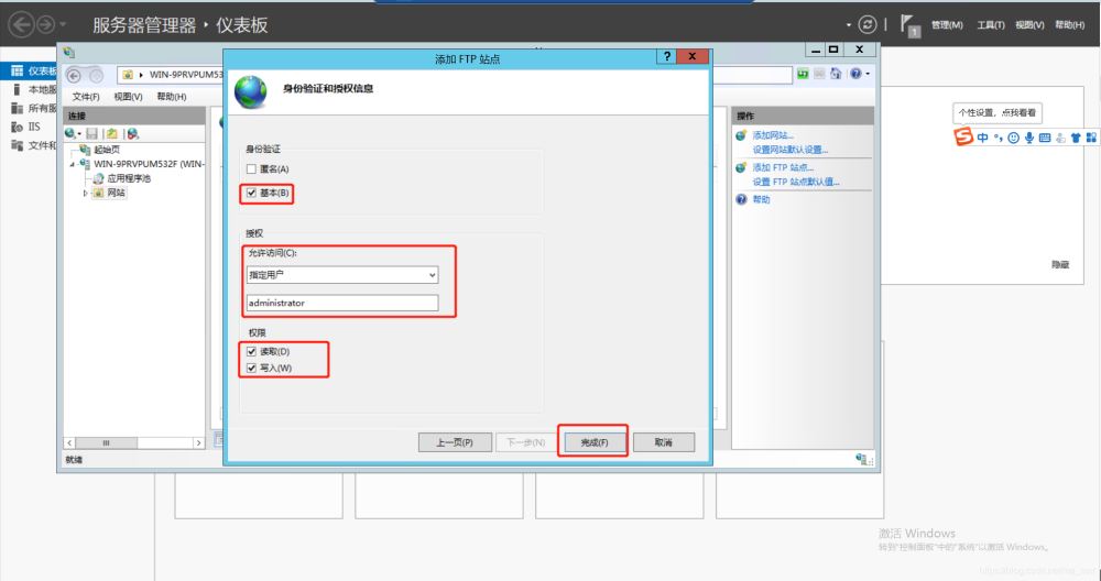 windwos鍵–》服務(wù)器管理器–》工具–》IIS管理器–》擴(kuò)展服務(wù)器(顯示網(wǎng)站并點擊)–》配置ftp站點名稱及物理路徑–》下一步–》選擇綁定IP地址(和無ssl)–》下一步–》身份驗證配置–》授權(quán)的用戶–》權(quán)限配置完成