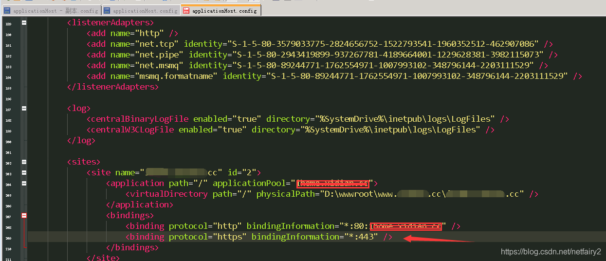會發現對應的網站域名下面bindingInformation=":443:" 缺少了對應域名,添加上你自己的主機域名保存即可。