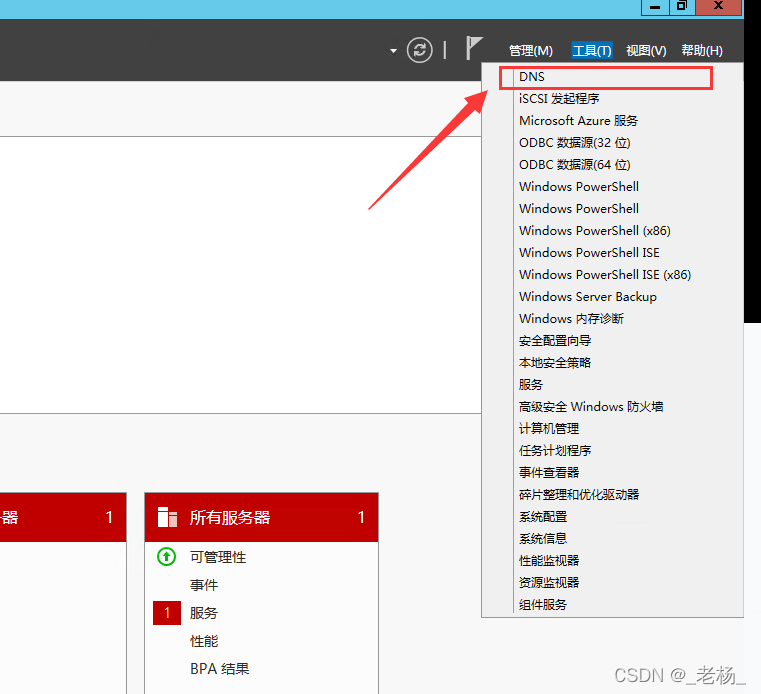 從服務管理器右側頂部的工具菜單中選擇 “DNS” 彈出配置頁面: