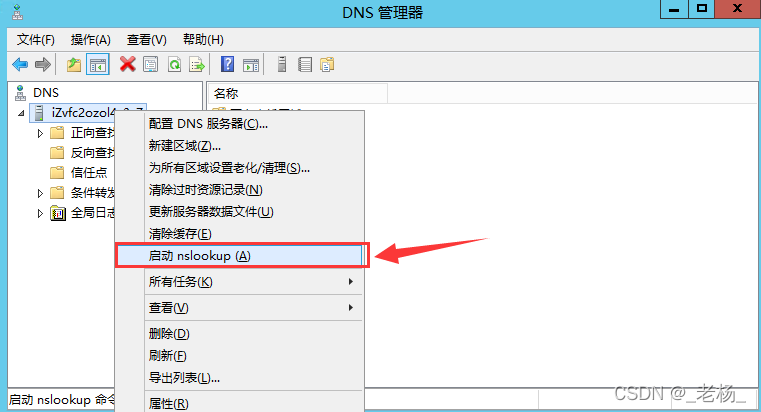 1、點擊我們的DNS服務器,右鍵啟動nslookup