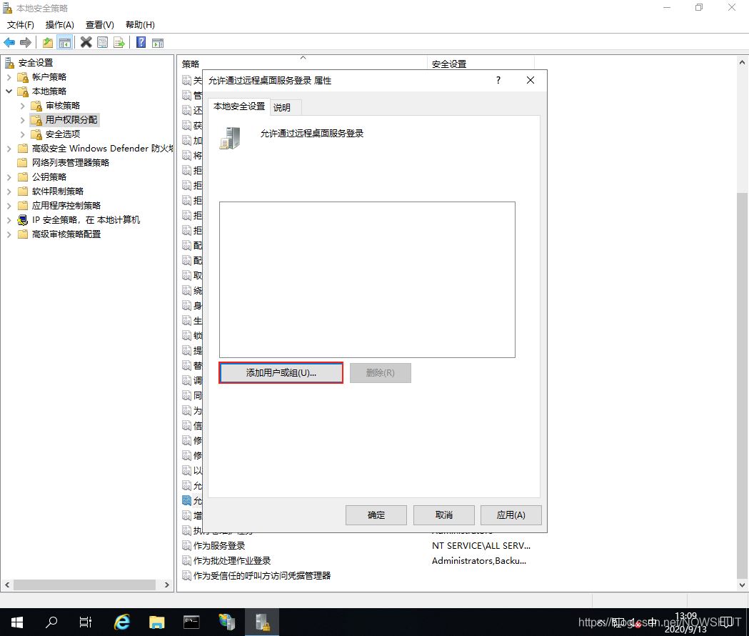 (3)進入【允許通過遠程桌面服務登錄 屬性】界面,可以看到列表中存在一個用戶賬戶Administrator和一個用戶組Remote Desktop Users。將列表清空,然后點擊【添加用戶或組】