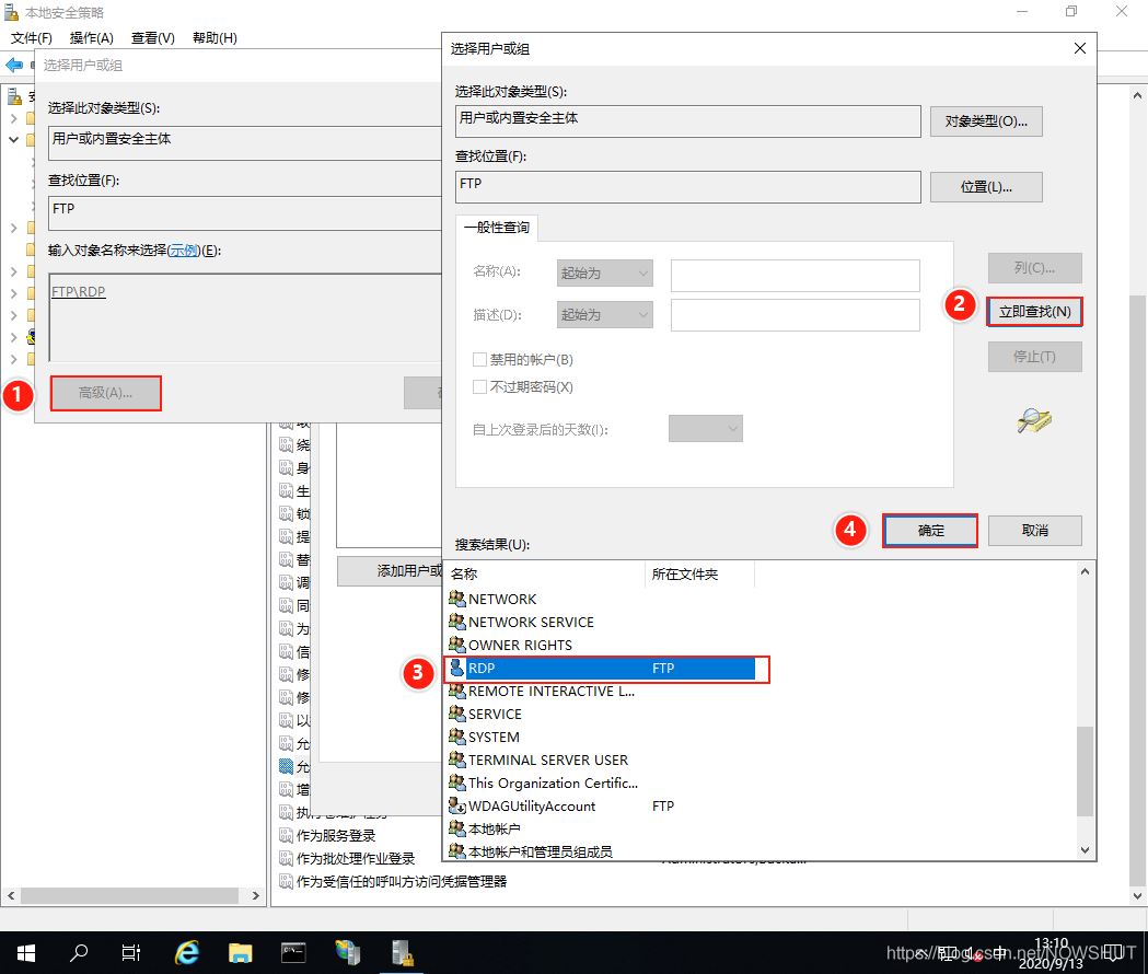 (4)進入【選擇用戶或組】對話框,點擊【高級】——>【立即查找】,在搜索結果中找到剛才創建的RDP用戶,選中,點擊【確定】。
